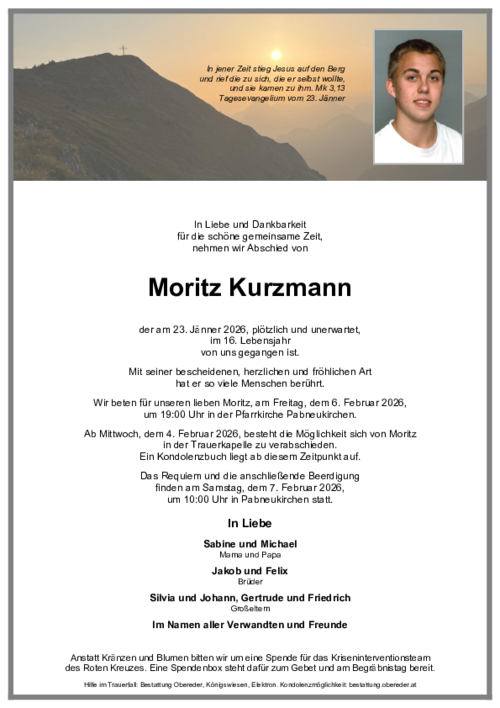 Liebe Familie Kurzmann und Mayer, unser aufrichtiges Beileid zum Tod eures Moritz von Familie Franz und Theresia Kastenhofer.