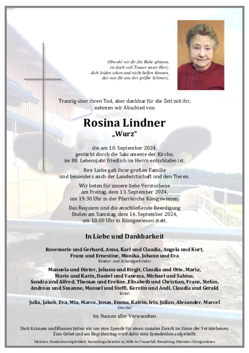 Die Erinnerung ist ein Fenster, durch das wir Dich sehen können, wann immer wir wollen." Ruhe in Frieden, liebe Tante Rosi! Elisabeth & Heinz
