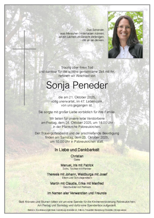 Sonjas Herzlichkeit und liebenswürdige Art werden unvergessen bleiben. Möge die Erinnerung an sie euch Trost und Kraft schenken. In tiefem Mitgefühl-Familie Lumetsberger,